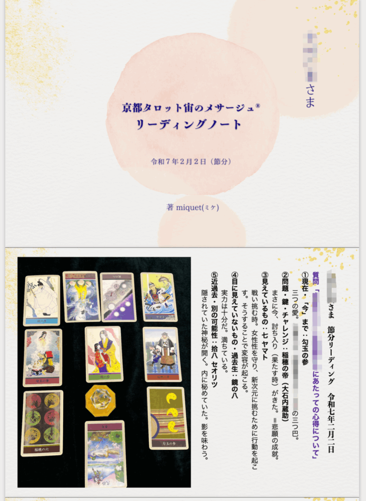 ※セッション後、約1週間以内にリーディングノート(A4用紙3-4枚程度)のPDFデータを送付させていただきます。